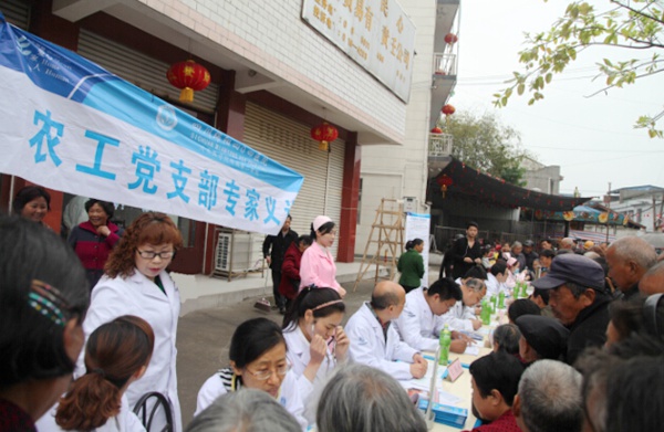 2015年4月19日上午,农工党绵阳四○四医院支部组织皮肤科、耳鼻喉科、普外科、心内科、泌尿科、妇产科等9个专业15名党员医疗专家前往安县河清镇开展“送医下乡”义诊活动,将健康送到老百姓家门口。