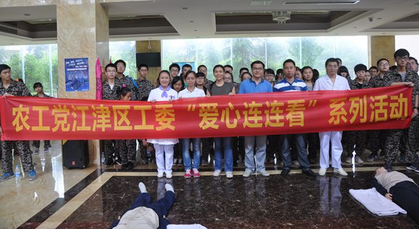 2015年7月2日,农工党江津区工委组织区中心医院心肺复苏专家一行5人来到江津中学樵坪拓展训练营地,为江津中学高二年级150位同学进行了现场心肺复苏的培训教学。
