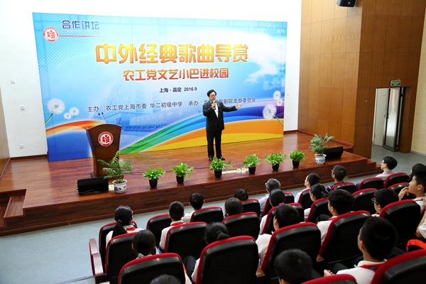 本次“中外经典歌曲导赏—农工党文艺小巴进校园”活动由农工党上海市委会、华二初级中学联合主办,农工党上海歌剧院支部承办,是农工党上海市委会深入开展坚持和发展中国特色社会主义学习实践活动的重要举措,也是华二初级中学“合作讲坛”的重要内容。活动在民主党派社会服务与校园文化创建之间搭建起了平台,让优质高雅艺术走进校园,旨在促进校园文化的建设与发展。