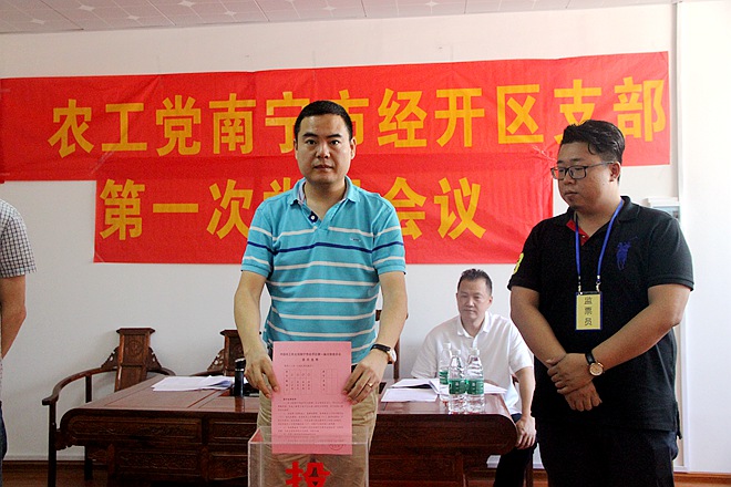 中共江南区委常委、统战部部长李海波、南宁经开区党群工作局副局长苏致诚分别对支部的成立表示热烈的祝贺,对支部第一届委员会寄予厚望,希望支部领导班子团结一心,积极带领全体党员发扬优良传统,发挥自身优势,不断加强政治理论学习,立足本职,热心党务,积极参政议政,认真履行职责,为经开区的经济建设和社会发展作出积极的贡献。