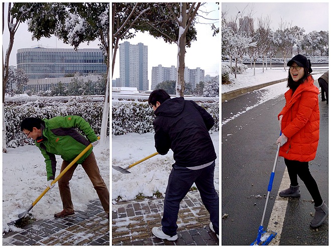 2018年1月25日,江苏迎来暴雪天气,无锡市的积雪深度达到5-15厘米,银装素裹的美景吸引了人们,但也给安全出行带来诸多不便和安全隐患。由于气温低,暴雪导致路面结冰,电动车以及行人在积满冰层的非机动车道和人行道上通行,非常危险。见此情形,农工党无锡环保支部的成员们立即行动起来,清扫积雪,消除隐患,方便群众出行。