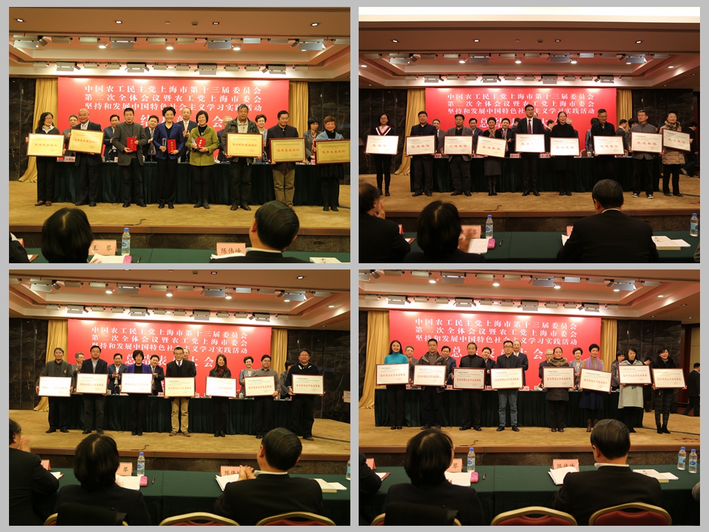 市委会副主委徐丛剑宣读了农工党中央和上海市委关于表彰坚持和发展中国特色社会主义学习实践活动优秀先进组织、集体和个人的有关决定。大会对中央评选出的上海6个优秀组织、25个先进组织、5名优秀党员、31名先进个人和市委会评选出的11个先进组织、22个先进集体、100名先进个人进行了统一表彰。市委会领导向受表彰组织和个人代表,颁发了奖牌、奖杯、荣誉证书。