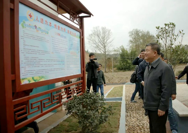 来到博爱广场,陈竺一行考察了中国红十字会在当地开展的“博爱家园”项目,实地察看基础设施及资料宣传牌等。在山香村赣商爱心卫生计生服务室,陈竺与乡村医生一一握手,深入了解卫生室运行情况,详细询问药品管理和疾控工作。得知卫生室给乡亲们提供全面周到的健康服务,陈竺十分高兴,并鼓励他们从小处着手,心贴心服务,倡导健康生活理念,在健康中国建设和促进健康脱贫等方面积极作为,争取发挥更大作用。