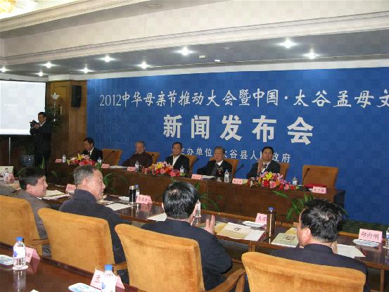 发布会主要介绍了2012中华母亲节推动大会暨中国·太谷孟母文化园的基本情况。山西省社科院研究员孟繁仁介绍了太谷孟母故里的考证情况,中华母亲节促进会会长李汉秋介绍了孟母的历史地位、思想教育内容及推广价值。刘峻杰部长在会上为太谷县授予了“中华母亲节活动基地”铜牌。