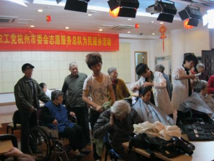 杭州市福利中心成立于1999年10月,现住有1千多名50岁以上的老人,大多患有心脑血管方面的老年疾病,一部分人行动不方便。2000年,市委会在充分考察、调研的基础上,与市福利中心签订合约,每年组织医疗、美容美发等方面的专家上门为老人提供免费的贴心服务。12年来,市委会与市福利中心充分合作,给老人们送去关怀和温暖,现在老人们一见到前来服务的专家,仿佛是久违的朋友一般,感到熟悉和亲切。