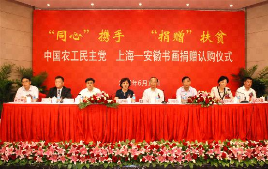 6月14日下午,农工党上海市委会和农工党安徽省委会在浦东联合举办“同心携手、捐赠扶贫”书画捐赠认购活动。来自沪皖两地农工党组织的著名书画家捐赠书画作品68幅,两地企业家党员积极认购,筹得善款51万元。对本次活动予以大力资助的市委会联络委主任胡伟康代表企业家和书画家向市委会会捐赠善款,该款项将用于农工党上海市委会的帮困扶贫和援建资助项目。农工党中央副主席汪纪戎,农工党上海市委会主委蔡威,中共市委统战部副部长吴捷,农工党安徽省委会副主委方才出席活动并讲话。农工党中央社会服务部部长刘峻杰,农工党上海市委会专职副主委金如颖、秘书长王晓东出席活动。