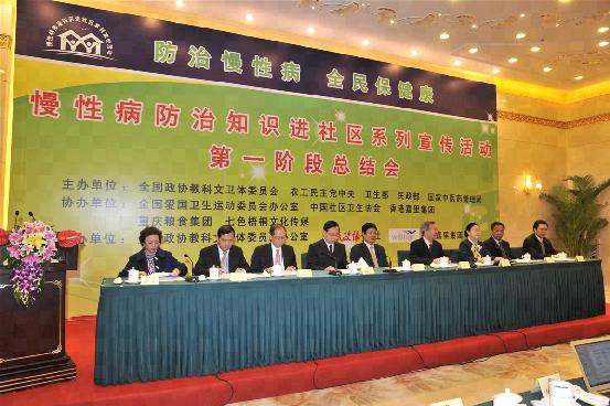 10月24日,由全国政协教科文卫体委员会、中国农工民主党中央委员会、卫生部、民政部和国家中医药管理局共同主办,全国爱国卫生运动委员会办公室、中国社区卫生协会、香港嘉里集团协办,人民政协报社、益海嘉里集团承办的“慢性病防治知识进社区”系列宣传活动第一阶段总结会在全国政协礼堂举行。全国政协副主席、农工党中央常务副主席陈宗兴,全国政协常委、教科文卫体委员会副主任张文康,全国政协副秘书长蒋作君,全国政协教科文卫体委员会办公室主任邬旦生出席会议。农工党中央社会服务部部长刘峻杰和国家中医药管理局办公室副主任赵明作为主办单位代表也在主席台就座,农工党中央社会服务部副部长张庆伟出席会议。会议由全国政协教科文卫体委员会驻会副主任张秋俭主持。