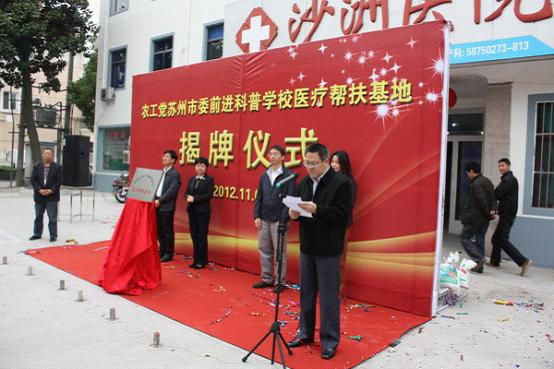今年,为进一步整合社会资源和内容,农工党苏州市委创新形式与苏州市科协合作成立“前进科普学校”,在社区服务基地、青少年服务基地、新农村帮扶基地相继揭牌后,11月3日上午,医疗帮扶基地在张家港沙洲医院揭牌。