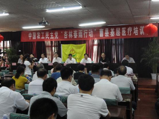 2013年6月29日农工党中央社会服务部“杏林春雨”—山东曹县基层医疗培训班及义诊活动在曹县县立医院顺利开展。农工党中央社会服务部副部长张庆伟出席活动并讲话;活动中农工党山东省委驻会副主委、山东省人大常委吕善勇、曹县县卫生局、县立医院的相关领导出席了启动仪式;为了加强基层医疗卫生人员老年病的诊治,还请来了首都医科大学检验诊断学系主任、北京天坛医院实验诊断中心主任、主任医师、博士生导师康熙雄教授,糖尿病专家、执业中医师聂文涛医师和济宁医学院附属医院肾病科李新建主任医师三名专家,分别从不同的角度和领域对加强老年病的防治进行专门的授课,来自曹县各基层医院、乡镇卫生院的二百余名医务工作者参加了培训。下午专家还在曹县县立医院开展了义诊活动,近百名老人参加了义诊咨询活动,活动受到了当地群众的一致好评。