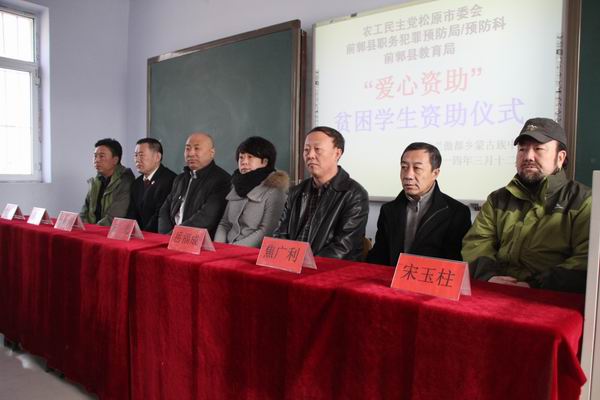 乌兰敖都乡蒙古族中学二年级学生刘倩,是个品学兼优的好学生,一年前,她的父亲不幸得了肝癌病逝,在治病期间家里欠下了债务。家里全靠母亲支撑,艰难度日,生活非常困难,已无力承担学费,几度想辍学,都被劝回学校。2013年,恰逢农工党松原市委会联合前郭县检查院和前郭县教育局在学校开展法律进校园活动,从学校了解到了刘倩家里的情况。市委会动员党员奉献爱心,支持她完成学业。市委会委员焦广利通过市委会了解这一情况后,慷慨解囊愿意资助刘倩同学, 2014年3月12日,市委会组织焦广利等当党内的爱心人士,联络前郭县检察院和教育局的领导,来到学校。焦广利为刘倩送去了助学资金,与学校和刘倩签订了资助协议,并承诺以后将帮助刘倩完成初中学业,圆她的上学梦。
