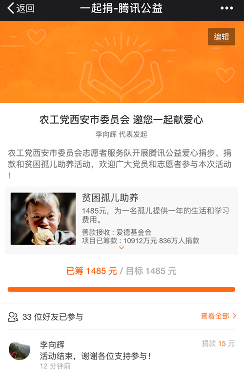 据悉,机关志愿者分队捐助贫困孤儿助养活动当日,33名志愿者在线上和线下同时参加了此次活动,共捐款1485元,成功对接助养了一名贫困孤儿,捐赠的款项将全部用于这一名贫困孤儿一年的生活和学习费用。
