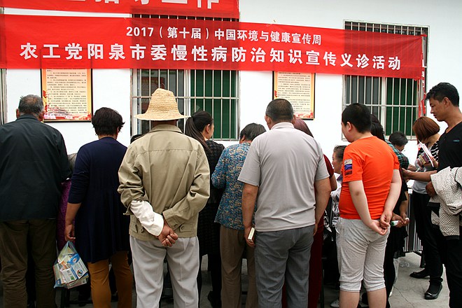 2017年6月3日,农工党阳泉市委会组织党内医疗专家组成爱心服务团赴盂县北下庄乡后川村,开展2017(第十届)中国环境与健康宣传周“环境与健康”慢性病防治知识宣传义诊活动。