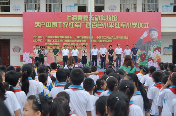 2017年6月20日上午,“上海赛复流动科技馆捐赠仪式”在广西百色小平红军小学(田东县平马镇上法小学)举行。农工党上海市委会专职副主委陈芳源,上海科普教育发展基金会副理事长金建敏,上海市慈善基金会副理事长施南昌,农工党广西区委会专职副主委何玉庭,中共田东县委常委、统战部部长王伟等领导出席仪式。