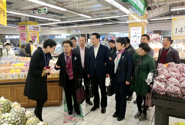 3月23日上午,农工党党员、杭州联谊农业金融投资有限公司理事长詹其顺和省委会社会服务部同志,陪同黔西南州委常委、州委统战部长罗春红一行到世纪联华超市和平购物城和物美超市东新路店进行实地考察,为“黔货出山”寻求浙江样板。(农工党浙江省委会社会服务部)