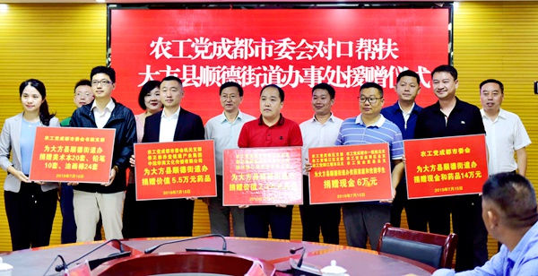 7月15日上午,农工党成都市委会对口帮扶大方县顺德街道办事处扶贫工作座谈会召开。座谈会由中共大方县委常委、统战部部长杨忠强主持。会议举行了市委会对大方县顺德街道办爱心捐赠仪式,捐赠总价值近14万元。其中,农工党成都市武侯区支部、锦江区支部、市第一人民医院总支、金堂县总支、龙泉驿区总支、都江堰市总支为大方县顺德街道贫困家庭和贫困学生捐赠现金6万元,农工党成都市机关支部、修正修养堂健康产业集团、中远华商文化传播有限公司捐赠价值5.5万元药品,农工党成都市青白江区总支、四川地森医药有限责任公司、四川怡仁堂药业有限公司捐赠价值2.3万元药品,农工党成都市书画支部捐赠美术本20套、铅笔10套、油画棒24套。