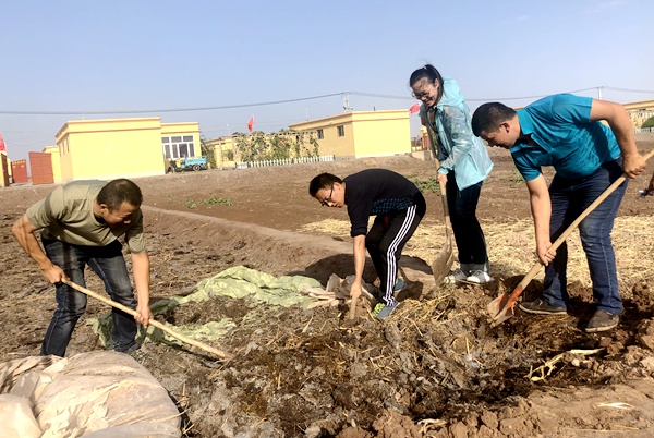 看着阿木提大哥家羊圈旁边沤制的羊粪,区委会办公室副主任王少波主动提议,我看了天气预报明天会下雨,咱们把这些羊粪撒到地里面吧!羊粪不但肥力了得,还能激活土壤中的大量微生物,使已经板结的土壤得以改良,同时还能使土壤中的有机物质大大提升,更有利于农作物直接吸收。说干就干,大家拿起铁锹、铁叉开始往地里撒羊粪,远一点的地方就用雨布兜过去撒,1个多小时过去了,看着撒满羊粪的地,阿木提大哥一边擦着汗一边高兴地说,明年肯定会有一个好收成。