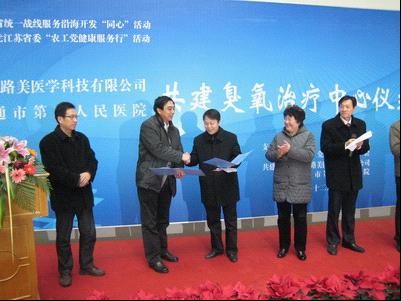 共建仪式上,耿献会与南通市第三人民医院院长王陆军代表双方签署并交换了捐赠协议书。根据协议,路美公司将捐赠2台价值110万元的臭氧治疗仪,并对医院的相关人员进行技术培训。臭氧治疗中心投入使用后,将拿出部分收入建立医疗扶贫基金,用于资助弱势群体的医疗费用。