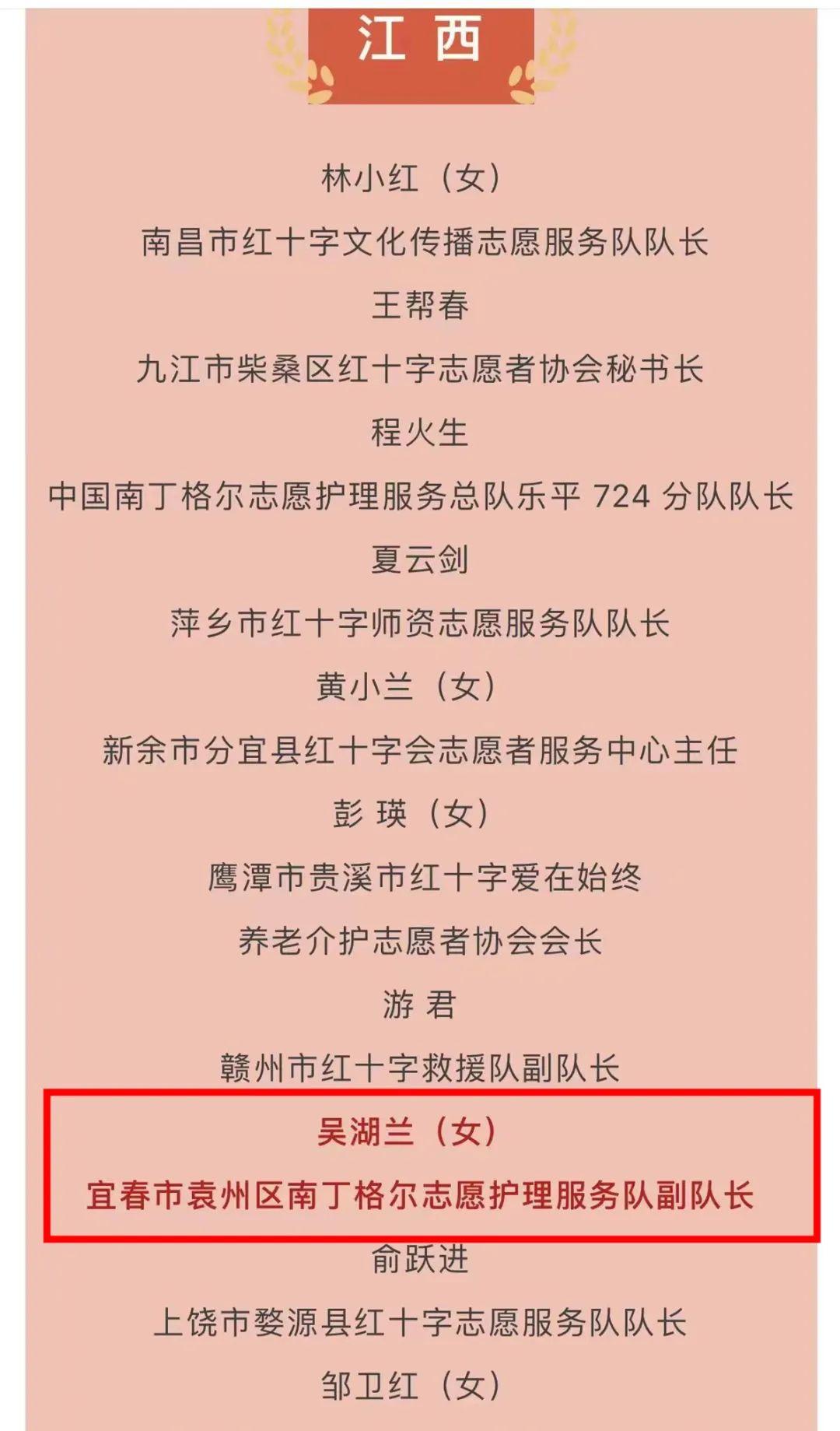 近日,中国红十字会总会公布了全国红十字志愿服务先进典型名单,对全国300名优秀红十字志愿者进行了表彰。宜春市袁州区二医院支部党员、宜春市第二人民医院心内科医师吴湖兰榜上有名,被评为全国红十字志愿者先进典型,成为宜春市唯一上榜者。
