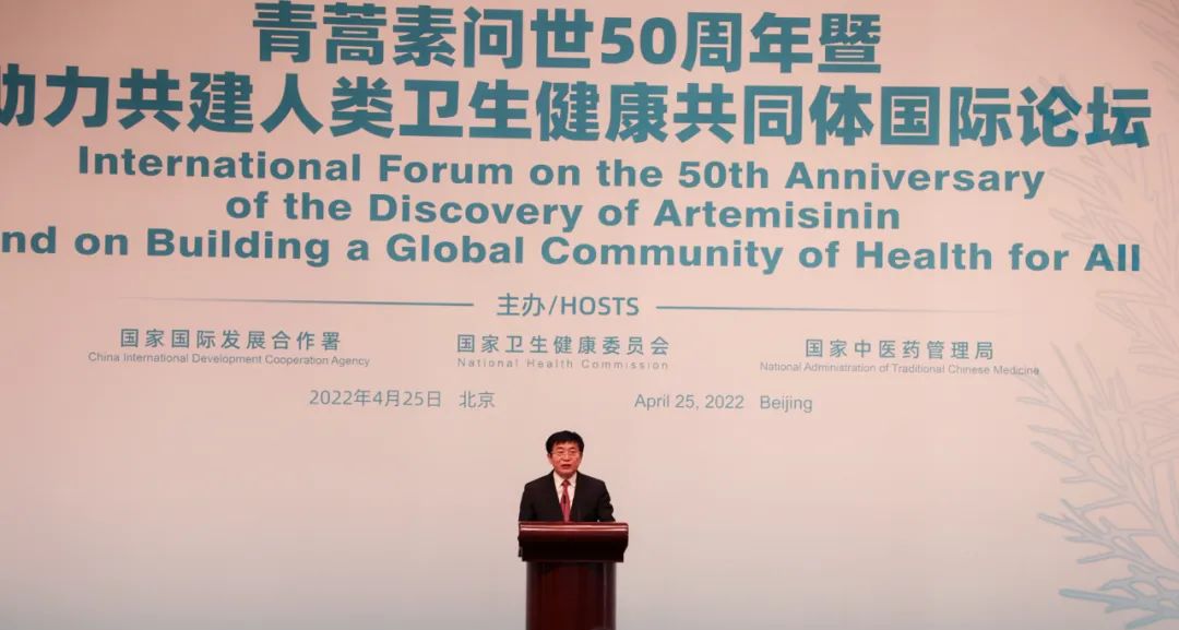 2022年4月25日,国家国际发展合作署、国家卫生健康委员会、国家中医药管理局在钓鱼台国宾馆共同举办“青蒿素问世50周年暨助力共建人类卫生健康共同体国际论坛”。