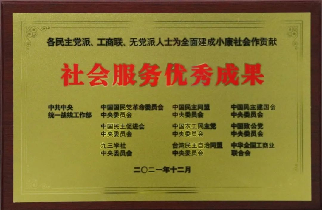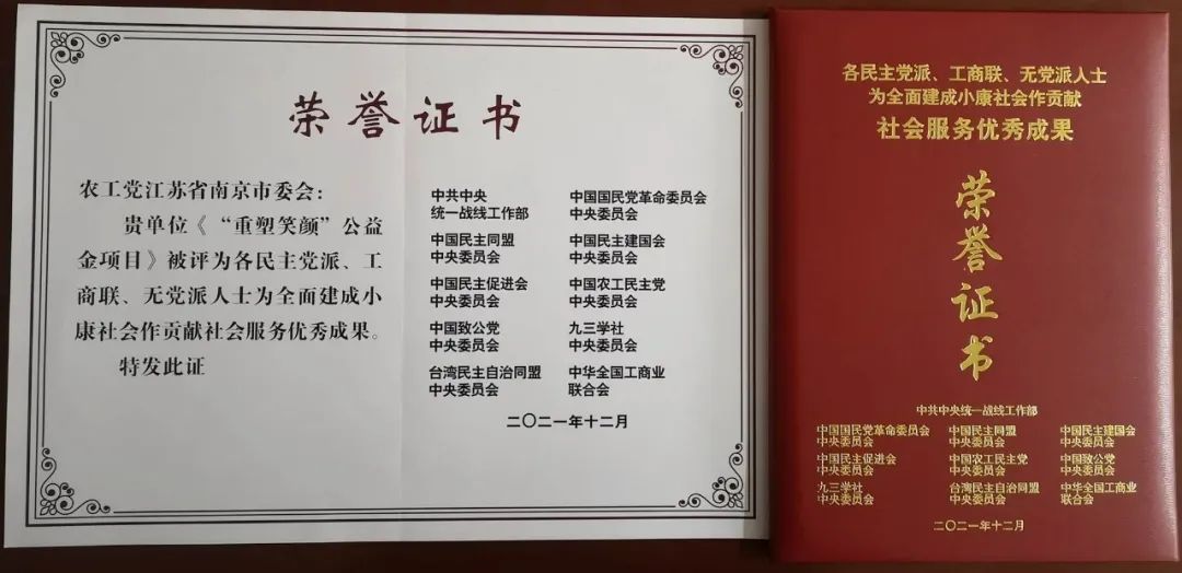 2021年,“重塑笑颜”公益金项目在中共中央统战部和各民主党派中央、全国工商联联合开展的“各民主党派、工商联、无党派人士为全面建成小康社会作贡献”评选表彰活动中,获得社会服务优秀成果表彰。