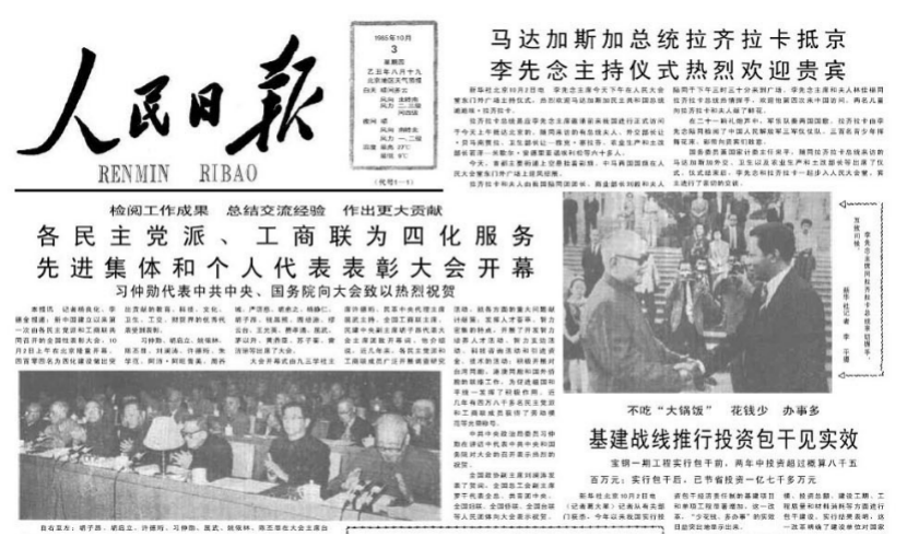 1985年10月2日至6日,新中国成立以来第一次由各民主党派中央和全国工商联共同召开的全国性为四化建设服务表彰大会在北京举行,各民主党派、工商联负责人和受到表彰的404名教育、科技、文化、卫生、工交、财贸界优秀代表出席会议。