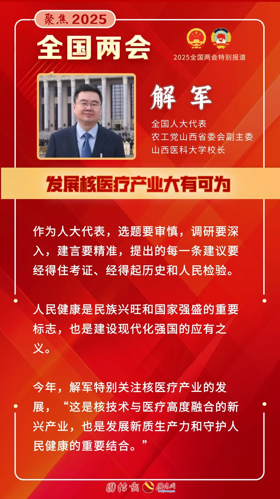 农工党山西省委会副主委、山西医科大学校长解军对今年全国两会的务实民主、便捷高效、言路通畅有着更为切身的感受理解,也进一步彰显了我国人民代表大会制度的显著优势。连续三年担任全国人大代表的解军,对此有着深刻的认识体悟和把握。