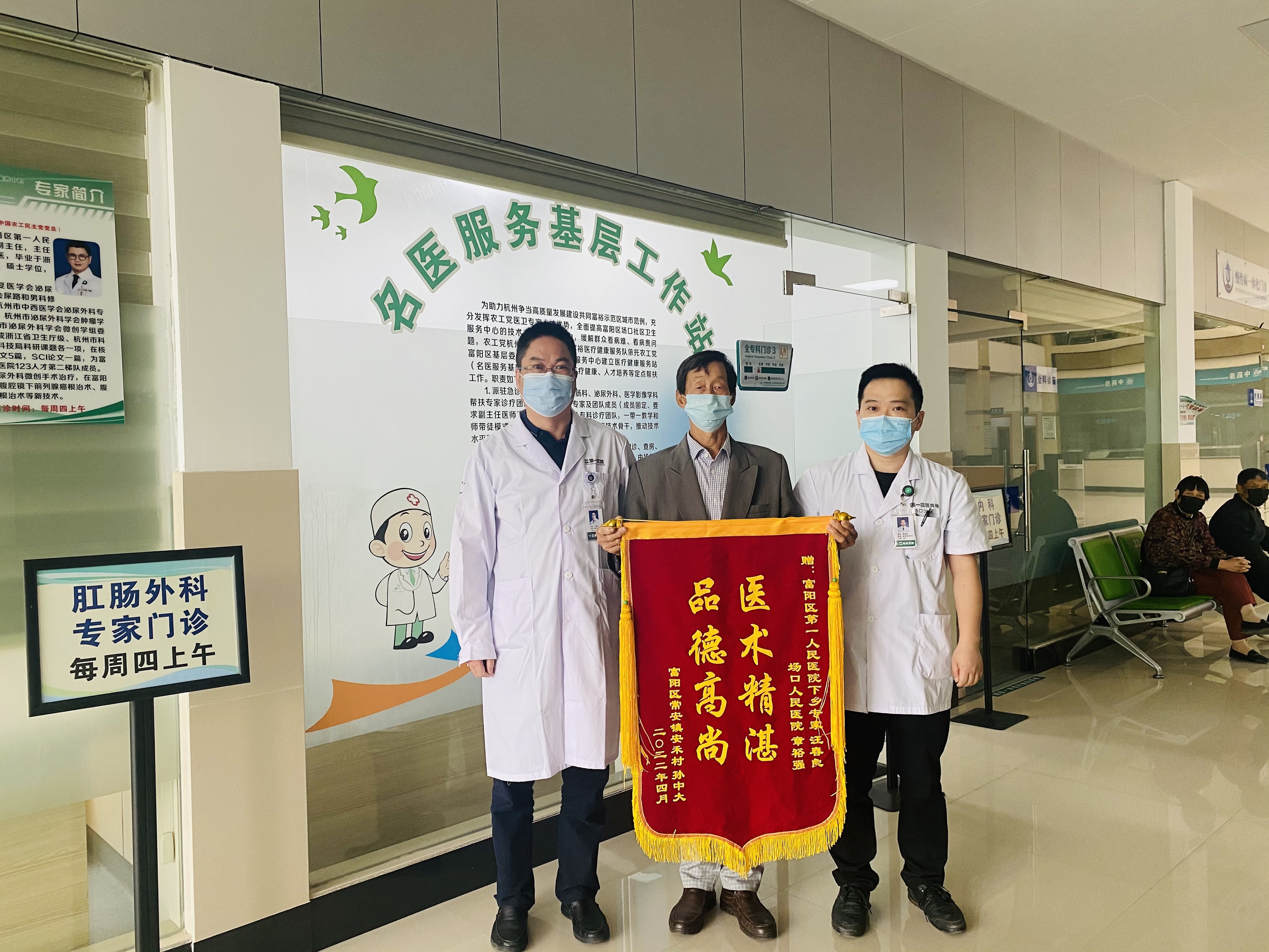 近日,设在浙江省杭州市富阳区场口社区卫生服务中心的农工党杭州市委会助力共同富裕社会服务基地——富阳区基层委医疗健康服务站像往日一样忙碌工作,常安镇的孙大伯拿着锦旗来到服务站,把一面“医术精湛 品德高尚”的锦旗交到服务站负责人、富阳区第一人民医院肛肠科主任汪春良手中,表达感激之意。