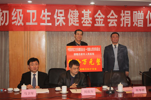 张李锁副主委代表中国初级卫生保健基金会“健康山西扶助基金”向吕梁市人民医院授公益合作牌匾及用于购买医疗设备的资助金50万元。
