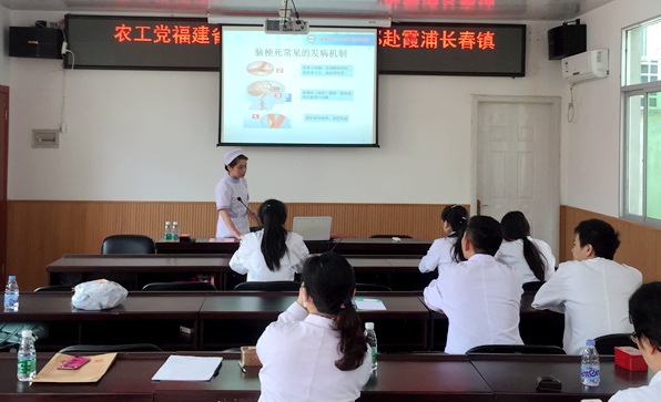 急诊科的副主任医师林立勇以《心肺复苏》开场,还专门带去心肺复苏人体模型在授课中实操示范,深入浅出地为当地医护人员讲解梅格救护知识。院感中心副主任护师陈丽芬特邀讲座《基层医疗机构医院感染管理基本要求》,从以患者为中心的各级工作人员到家属的卫生问题,从药品质量、保存方法到使用过程中的卫生监控及操作规范,从院内环境卫生到医疗器械的卫生维护,再到医疗废弃物的处理等等,护理部主任吴航洲以《急性脑卒中的快速识别及院前急救》为主题,内容简明扼要,并细心准备了图文并茂的资料《教你10秒快速识别中风》供当地医护人员开展知识宣教。三个讲座主题契合当地所需,通过三位主任的精彩阐述,听者心中许多疑问得以豁然开朗。