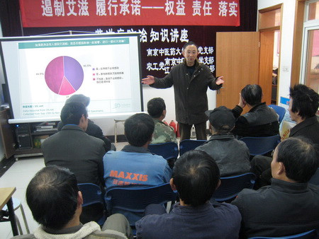(江苏省委)今年是第23个"世界艾滋病日",主题为"遏制艾滋,履行承诺--权益、责任、落实"。2010年12月8日下午,南京中医药大学在职支部与江苏省出入境检验检疫局支部在朝天宫街道汉西门社区会议室联合开展了"世界艾滋病日"主题宣传活动,宣传的对象主要是在该社区从事建筑工作的民工。