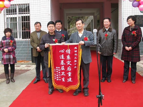 刘峻杰部长和王安龙副主委共同为“中国农工民主党定点帮扶乡镇卫生院”揭牌。刘峻杰部长代表农工党中央接受了南郑县人民政府赠送的“情系灾后重建,心连基层卫生”锦旗。刘峻杰部长一行还认真视察了红庙前进中心卫生院的设施设备。
