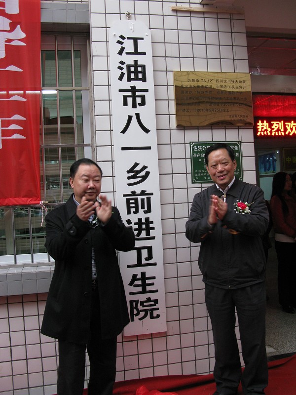 江油市八一乡前进卫生院在2008年汶川特大地震中严重受损,在农工党中央及四川省委会的积极协调下,将其确定为农工党的援建项目,并农工党员“特殊党费”和爱心捐款200万元进行援建。在当地党委、政府的领导下,经过有关单位的认真设计和精心施工,如今恢复重建后的门诊综合楼拔地而起,软硬件焕然一新,医疗卫生条件得到极大的改善,为卫生院今后的发展打下了坚实的基础。在整个抗震救灾和灾后重建期间,除八一乡前进卫生院外,农工党在绵阳市还援建了江油市、盐亭县的19个村卫生室,通过中国红十字总会援建了绵阳市游仙区和梓潼县的2个卫生院,并捐赠医疗设备、药品等价值120余万元。
