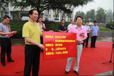 (江苏) 2011年8月11日上午,细雨霏霏,在美丽的茉莉花之乡,金牛湖畔举行了农工党江苏省直经济支部党员、南京路美医学科技有限公司董事长耿献会向六合区人民医院、六合区冶山镇卫生院两家医疗机构捐赠医疗设备仪式,此次捐赠的医疗设备总价值142万元。此前,耿献会已经向西部老少边贫地区基层医疗机构捐赠了总价值近一千七百万元医疗设备和其他民生项目。出席这次捐赠仪式的有南京市工商局局长、党组书记马和欣,六和区副区长吴继才,农工党江苏省委联络处副处长王夫玉等领导同志。