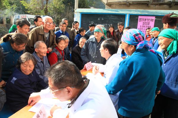 由于事先的通知和准备工作充分,活动开始时,璜田乡卫生院门前临时安置的专家就诊席前就已人头攒动,前来候诊的有白发苍苍老人、有怀抱孩子的年轻夫妇,他们相携而来,满怀期待,让送医上门的专家们给好好看看病。专家们按科室分工合作,量血压、查内科、看五官、问病史、开处方,有条不紊地为山村乡民精心诊疗,耐心地为就诊者提问解疑释惑。现场一位老人高兴的说:“真没想到只用一次就把身上的所有病都看了,且是这么好的专家,非常感谢农工党专家带给我们这么大的方便。”
