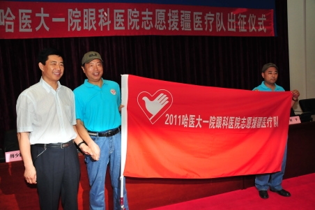 7月7日,应新疆阿勒泰地区卫生局的要求,由黑龙江省卫生厅派遣,(左图为黑龙江省卫生厅厅长赵忠厚<左一>为医疗队授旗,刘平<左二>接旗)农工党员、哈医大一院眼科医院院长刘平志愿医疗队抽调6名最精干医护人员,在最短时间内组建了“2011哈医大一院眼科医院志愿援疆医疗队”,在省卫生厅医政处领导和队长刘平教授的带领下,远赴万里之外新疆阿勒泰地区所属的福海县、富蕴县、青河县和新疆生产建设兵团十师等地,为那里的白内障患者实施复明扶贫手术。