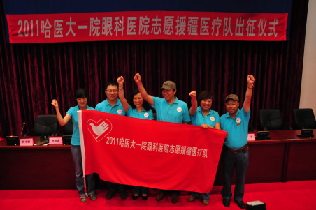 据了解,这次志愿援疆活动,(左图为“2011哈医大一院眼科医院志愿援疆医疗队”全体成员出征宣誓)是我省按照中央统一部署对新疆阿勒泰地区实施对口科技、医疗、卫生、教育人才支援以外的医疗卫生援疆的临时性重要项目,医疗队将在阿勒泰工作7天,将使阿勒泰地区150多名白内障患者重见光明,可惠及哈萨克、回族、维吾尔、蒙古族、汉族等多个民族的150多个家庭。可为提高新疆各族人民生活水平,为促进民族团结,为新疆实现全面建设小康社会,为人民健康做出一定贡献。