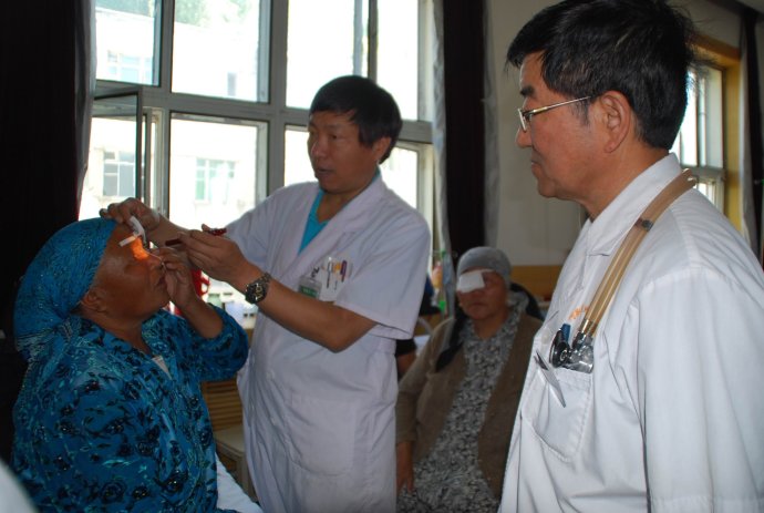 阿勒泰地区人民医院紧急将会议室、值班室全部改造为临时病房以容纳此次手术的白内障病人。(左图为刘平、黑龙江省卫生厅医政处曹俊环<右一、女>为术后白内障患者揭纱)