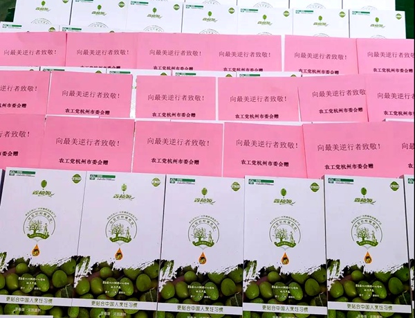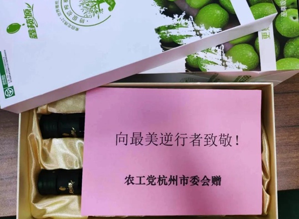 2020年6月5日,农工党杭州市委会积极响应中央统战部、农工党中央关于助力湖北解决特色农产品滞销问题的号召,采取“以买代帮”的形式,向湖北省十堰市统一采购价值10万余元的特级橄榄油礼盒636份,分别捐赠给杭州市318位援鄂医护人员,缓解湖北因疫情影响产生的农特产品库存压力,并致敬“最美逆行者”。