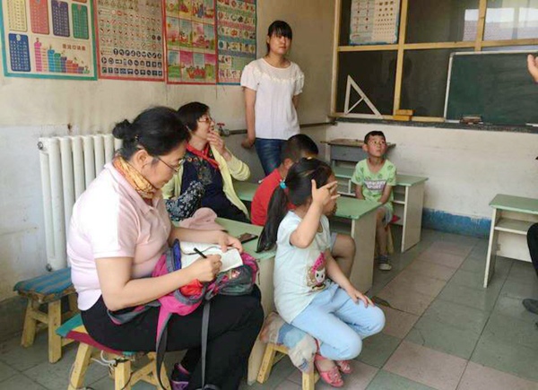 去年暴雨冲毁了该村不少村民房屋,这个教学点因地处山坡高处而幸免,当地政府安排灾民临时住进教学点的所有空余教室,现只留下二间教室和一间教师办公兼休息室。一进教室,想象中贫困小学的样子真实地呈现在我们面前,墙皮剥落、冬季取暖烟火熏黑的斑驳墙面、低矮破旧的课桌、狭促昏暗的空间和一个什么科目都要会教的乡村女教师,外加几个留守儿童。