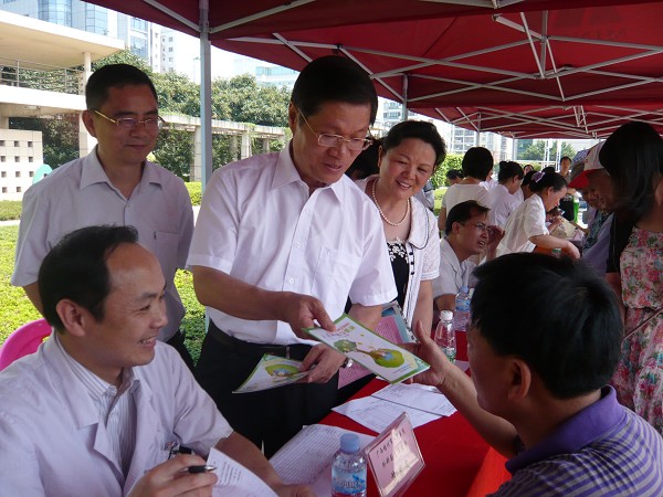 图说明:自治区政协副主席、农工党广西区委主委彭钊(前左二)与医疗专家一起给群众发人居环境与健康宣传资料。