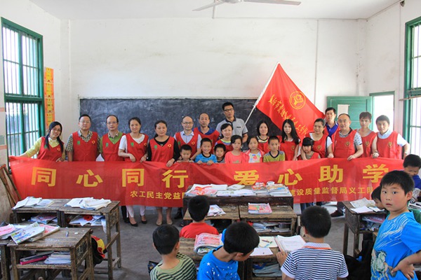 2015年6月5日下午,农工党益阳市委会市直一支部联合市交通建设质量监督局义工队在桃江县松木塘镇天子山村小学共同开展了“同心同行,爱心助学”主题活动。队员们为该小学学生送去了大量教学用品和学习用品,以有助于提高留守儿童阅读能力和增强文体活动。
