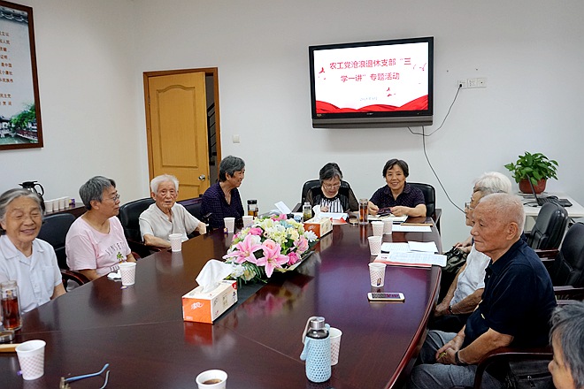 2018年9月12日下午,农工党苏州市沧浪退休支部在农工党苏州市委机关会议室内开展了“三学一讲”专题活动,支部主任王梅珍为老党员们上了一节生动的“党课”。