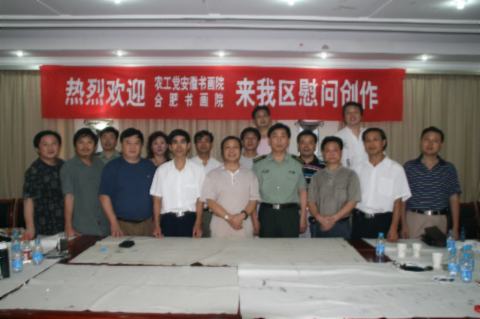 今年是中国人民解放军建军八十一周年,为庆祝“八一”建军节的到来,7月25日下午,农工党安徽省委组织党内书画院的书画家们前往中国人民解放军合肥警备区进行慰问书画创作活动,得到警备区指战员的热烈欢迎。虽是烈日炎炎的盛夏,但书画家们不辞辛苦,以饱满的热情创作了一幅幅山水、人物、花鸟画和书法作品,其中巨幅作品《春之韵》由书画家们集体创作完成的,体现了书画家对广大官兵的深情厚谊和美好的祝愿。