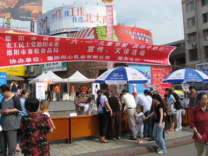 农工党德阳市委历来重视儿童的健康成长,每年6月1日,组织医卫人员参加“六一儿童节”、“世界牛奶日”义诊、宣传活动。今年又联合德阳市政协,德阳市畜牧局,组织十余名医卫专家在德阳市艺术宫小广场前开展了为儿童义诊、义检、健康咨询、生育咨询、心理咨询、营养咨询等服务的健康宣传活动。共义诊、义检、咨询670余人次,发送健康宣传资料2000余份。德阳市“同心奶”乳品公司、市人寿保险公司也配合本次活动,同时为儿童开展了免费喝牛奶、免费送儿童保险的活动。德阳市政协文教体卫委员会主任曹光蕊、农工党德阳市委主委谢天佑到现场看望慰问工作人员及儿童。