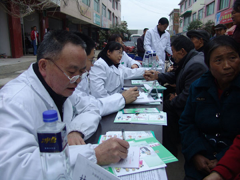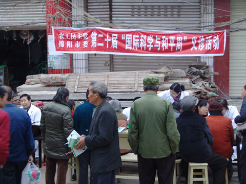 2008年11月13日,在绵阳,这是一个初冬的典型阴雨天,尽管雨小得不易被察觉,却在嗖嗖的凉风中感觉寒意逼人。5.12地震刚过去整整半年时间,沿途仍可见震后还来不及拆除的残垣断壁,但这些似乎没有影响人们赶集的兴致,9点钟,游仙区忠兴场镇已是熙熙攘攘的人流,好一派热闹景象。在这个平常而又似乎不平常的日子,农工党绵阳市委第二十届“国际科学与和平周”义诊活动就在此在兴奋的人群包围中热烈地进行着。