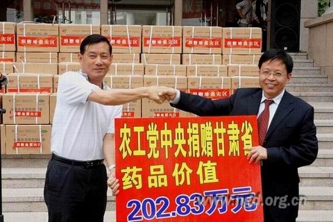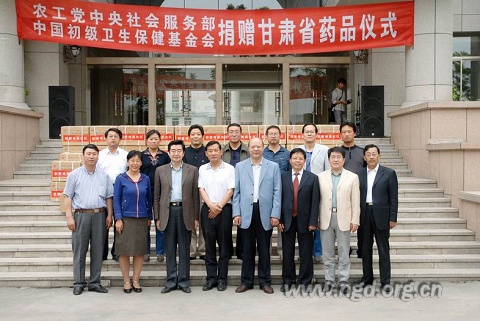 009年5月15日下午,农工党中央、中国初级卫生保健基金会向甘肃省捐赠了价值202万元的药品,这批药品主要用于解决震灾后部分地方基层卫生院经费紧张、药品短缺的困难。农工党中央社会服务部副部长、中国初级卫生保健基金会理事刘峻杰,中共甘肃省委统战部郭清祥副巡视员,省卫生厅王晓明副厅长,农工党甘肃省委会雷怀彦副主委出席捐赠仪式并分别讲话。接受捐赠的五家乡镇卫生院代表和所在地市的农工党基层组织代表也参加了捐赠仪式。