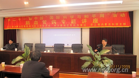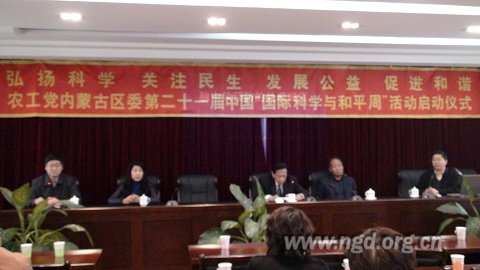中国“国际科学与和平周”是世界性的活动,农工党内蒙古自治区委已经连续15年在全区各地开展了形式多样的活动。今年的“国际科学与和平周”主题是“弘扬科学,关注民生,发展公益,促进和谐”,农工党内蒙古自治区委在这一周内将举办奶牛饲养科技讲座、大气环境与人类健康讲座、法律知识讲座等活动。