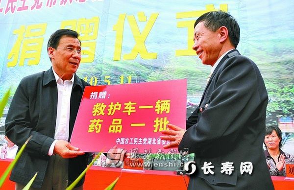 511日,省政协副主席、农工党湖北省委主委周宜开代表农工党湖北省委,将价值11万元的一辆救护车和价值6万元的药品捐赠给宣恩县沙道沟镇卫生院。