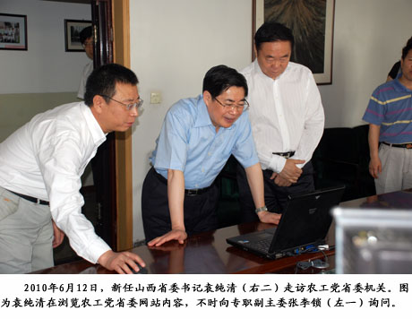 在农工党山西省委机关,袁纯清亲切看望了机关工作人员,与大家握手交谈并询问工作和生活情况。袁纯清还兴致勃勃地浏览了农工党山西省委的网站,并不时向专职副主委张李锁询问情况。 袁纯清对农工党山西省委的。他说,民主党派人才济济,联系广泛,要更好地发挥自身的优势,紧紧围绕全省经济社会发展中的重大问题建言献策,提供服务,做出积极贡献。