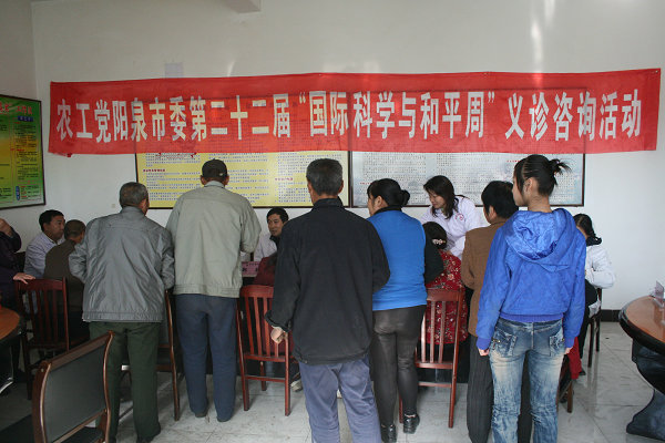 日前,为深入学习贯彻十七届五中全会精神,积极推进社会主义核心价值体系学习教育活动深入开展,农工党阳泉市委会组织党内近20名专家到平定县娘子关镇旧关村,开展第二十二届“国际科学与和平周”活动,为这里的百姓进行义诊咨询服务。 听闻专家服务团到来的消息后,村民纷纷赶来,急切地希望得到服务和指导。活动现场,来自市内各大医院的农工党医学专家们用自己携带的医疗器材为村民们进行测血压、听诊心音、中医诊断等各项免费诊疗和咨询。每位专家的诊桌前都有村民在排队等候,现场人头攒动,村民踊跃就诊。专家们不仅为村民进行身体检查,还耐心的为村民们讲解疾病预防控制及用药等方面的注意事项,并给出治疗和健康生活的建议。现场的农业技术、法律、计生、社保方面的党内专家们也为村民们提供各自的专业服务,现场发放各种宣传资料700余份。 此次义诊服务活动吸引了二百多名村民前来就诊咨询,并受到了当地百姓的热烈欢迎,产生了良好的社会影响,为农工党树立了良好的社会形象。
